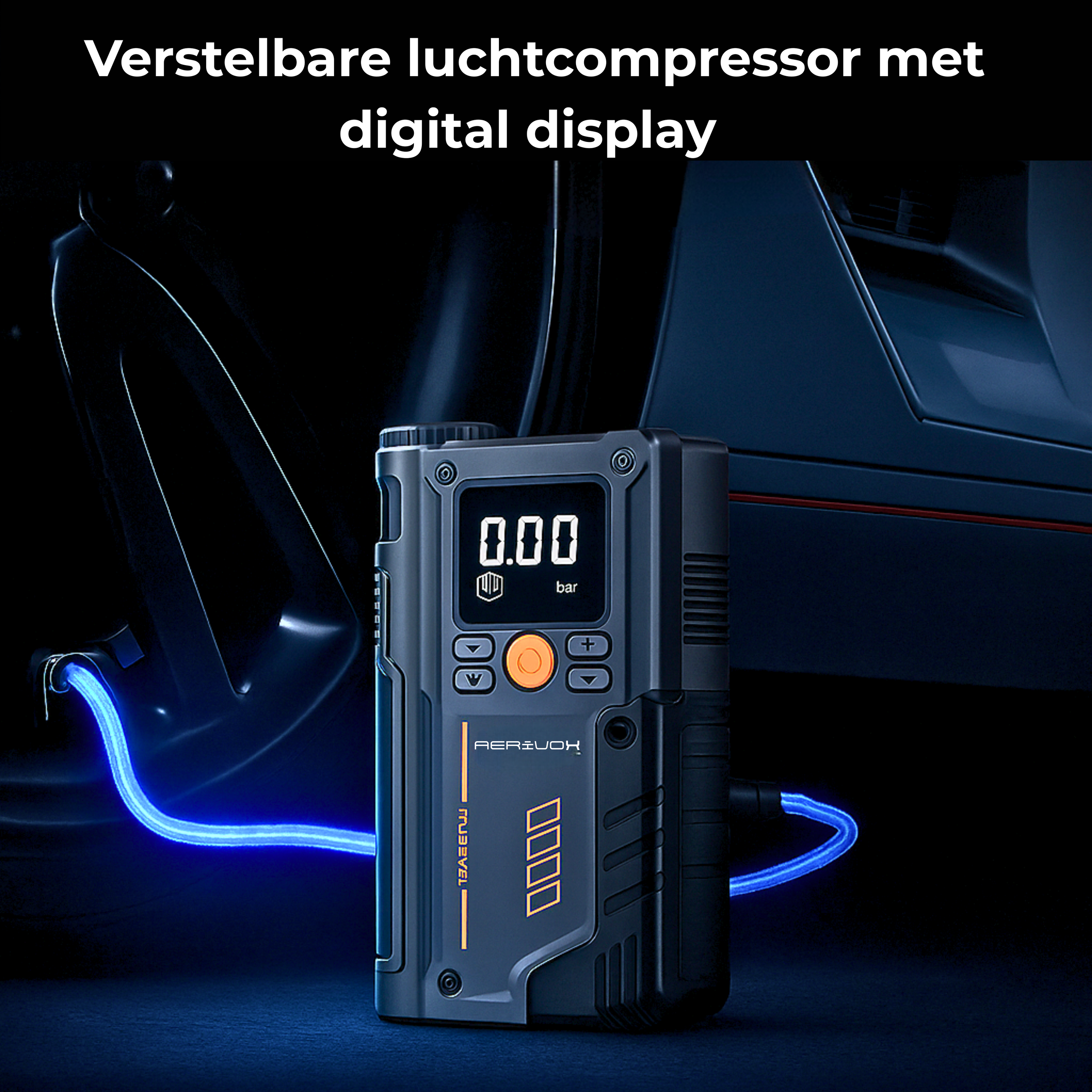De Aerivox™ 4-in-1 Jumpstarter geeft je directe startkracht, verlichting en lucht voor je banden – geleverd met een compacte opbergkoffer