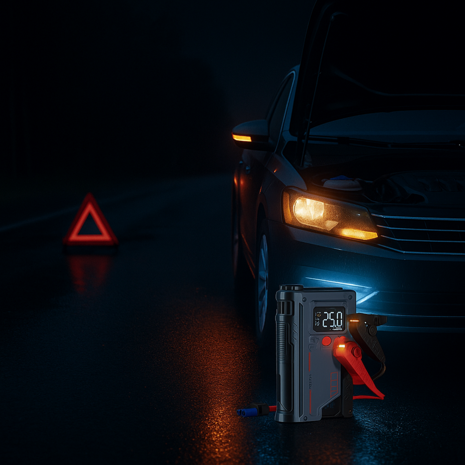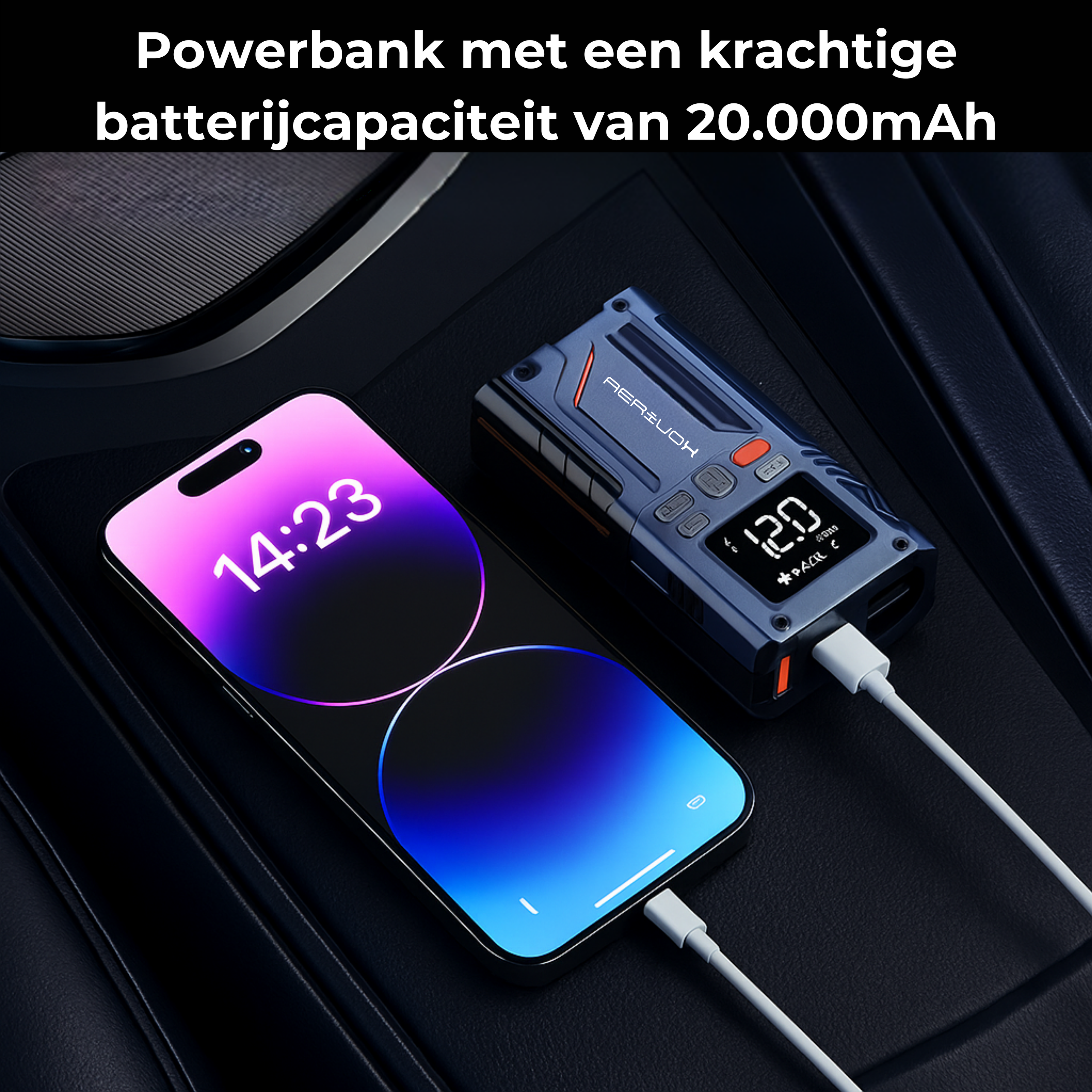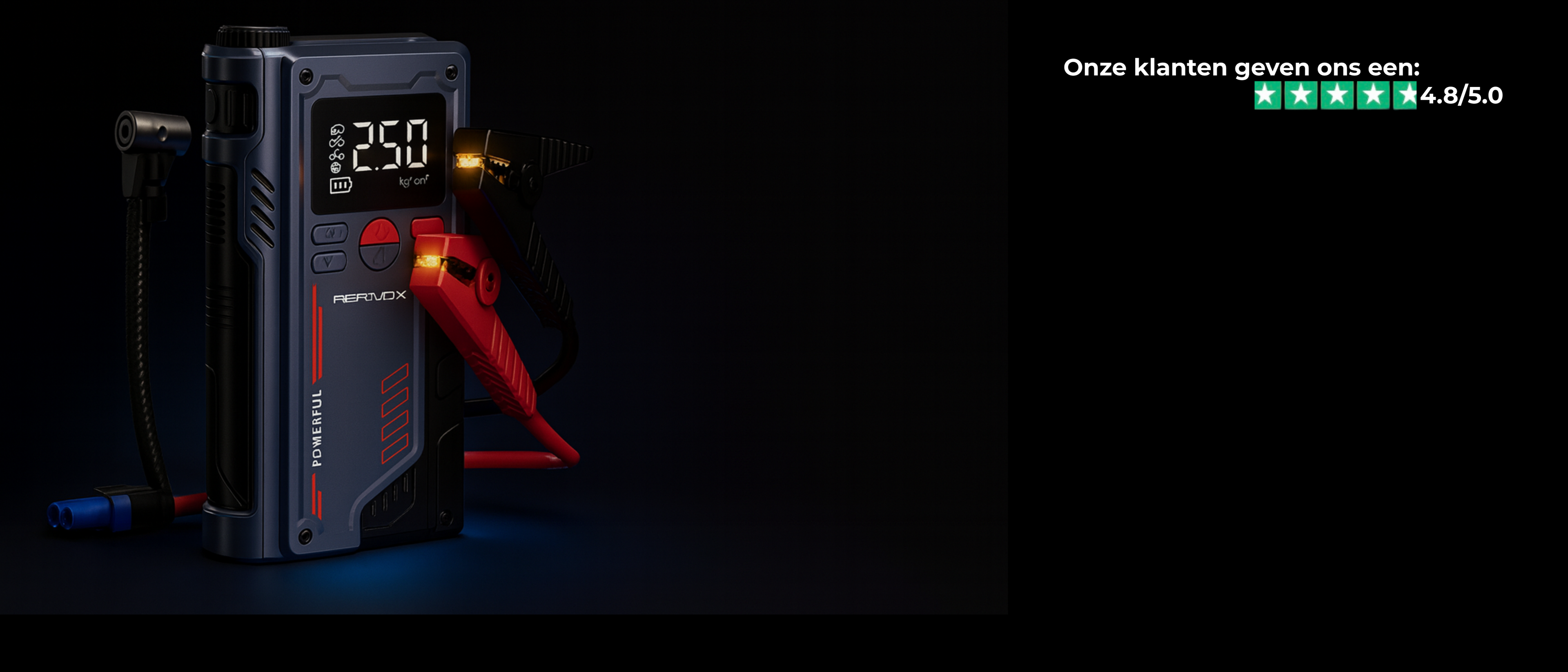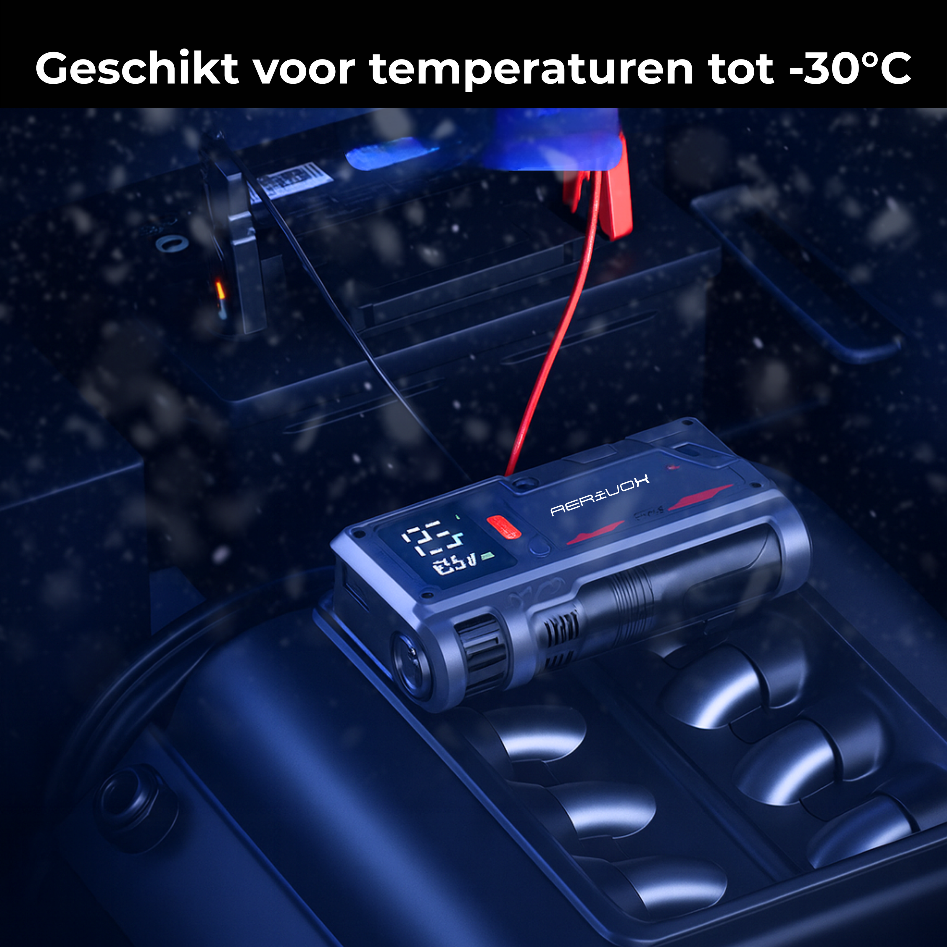 De Aerivox™ 4-in-1 Jumpstarter geeft je directe startkracht, verlichting en lucht voor je banden – geleverd met een compacte opbergkoffer